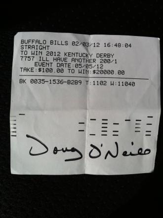 PRIMM, Nev. – Doug O’Neill has been the face of horse racing for the better part of two months. I’ll Have Another’s Kentucky Derby win on the first Saturday in May put him in the spotlight and the trainer’s bearded visage was omnipresent through their Preakness victory and then the announcement a day before the Belmont that I’ll Have Another had tendonitis in his front left leg and would be retired, ending his Triple Crown bid. O’Neill has also been at the center of doping discussions and is scheduled to start a 45-day suspension on Sunday, July 1 (he has said he plans to appeal). But he left all that behind at 5 a.m. Monday as he left Hollywood Park with Team O’Neill racing manager Steve Rothblum and Santa Anita’s CEO, Mark Verge. Their destination was the Primm Valley Resort and Casino in this town on the Nevada/California border. Primm is less than 40 miles south of the Las Vegas Strip on I-15 and the place where locals go when the Mega Millions jackpot gets out of control as lotteries are outlawed in Nevada but there’s a lotto store right over the state line. Primm is also the first place for Californians to find Kentucky Derby futures, as Lucky’s Race and Sports Books run the books here. On this day, O’Neill was just a regular horseplayer all excited about cashing a Kentucky Derby future-book ticket. Okay, so he wasn’t a typical bettor, as he was holding the only 200-1 ticket on I’ll Have Another bought at the Buffalo Bill’s race book, but since he was clean-shaven, he could have walked in incognito if the three Vegas sports reporters waiting for him hadn’t been tipped off to his arrival. O’Neill’s $100 ticket was bought at 4:48 p.m. Pacific on Feb. 3, the day before I’ll Have Another made his 2012 debut in the Robert B. Lewis Stakes at Santa Anita. Verge, who hadn’t been named as Santa Anita CEO at that time but was a childhood friend of O’Neill’s, said he received a call from a mutual friend, Chuck Navarro, that week. “Chuck told me he was here and I’ll Have Another was 200-1,” Verge said. “I said ‘You’re kidding me’ and called Doug.” “Mark said ‘what do you think?’ and I said ‘We gotta support him,’ ” O’Neill said. “He’s always been so talented, so we were optimistic and felt 200-1 was a fair price and very realistic.” O’Neill and Verge said Navarro made the $100 wager for them. Lucky’s director of marketing, Dan Shapiro, who was also here to witness the ticket being cashed, said that was a limit wager and the only one made at that price, and the odds were dropped to 100-1. O’Neill and Verge said Navarro bet $50 for himself at 100-1 and made six bets in all. By the time he left, Lucky’s had lowered I’ll Have Another’s odds to 25-1, but that wasn’t enough to keep the book from having its first losing Derby futures in the company’s four years of existence, Shapiro said. On Monday, O’Neill had to fill out a Currency Transaction Report, required for all casino transactions that exceed $10,000, and then was paid the $20,000 profit $100 at a time in four stacks of $5,000 each (plus his $100 bet back). O’Neill and Verge said they were going to spread the winnings around the stable since the colt’s success was a team effort. Regardless, you know that bettor’s lament when he makes a big score and says, “Now I’m finally even”? or that he needs another one to get ahead? Well, O’Neill was definitely in horseplayer mode. “I’ve been betting the Derby futures since I can remember, even before I should have been betting them,” said the 44-year-old. “I’ve never been able to cash until now. I’m sure I’ve lost more than this will cash. I usually bet two to three a year, it’s fun to follow their progress.” O’Neill said he hasn’t bet his own horses in the futures since 2006 when he had the reigning 2-year-old champ, Stevie Wonderboy, and then in 2007 when he had Notional, Great Hunter, and Liquidity with only Great Hunter and Liquidity making the Derby starting gate. But this year’s bet looked promising from the beginning, as I’ll Have Another won the Robert B. Lewis at odds of 43-1 and then went on to win the Santa Anita Derby. Still, he went off at 15-1 on Derby Day and O’Neill and Rothblum said they still have uncashed tickets from Churchill Downs. The whirlwind tour after the Derby win also kept O’Neill from cashing his Nevada ticket, so he carried it, neatly folded in a square, as a good-luck charm in numerous shirt pockets. “I treated it like a baby, like it was my third child,” said the father of two. The luck ran out before the Belmont, but O’Neill repeated what he said in his press conference to announce I’ll Have Another’s sudden retirement: “It was far from tragic,” he said Monday. “The highs were incredible and the lows weren’t that low. We’re grateful for the beautiful ride he gave us.” O’Neill said he’s optimistic about his crop of 2-year-olds. “We have 15 of them, the best crop we’ve ever had,” he said, mentioning three promising colts by name: Cinco de Mario (named after Derby-winning jockey Mario Gutierrez), Know More and the cheekily named He’s Had Enough. “Hopefully one of those will develop and give us another run at it.” Spoken like a trainer – but also like a bettor who can’t wait for the 2013 Derby futures to be posted around Labor Day.
