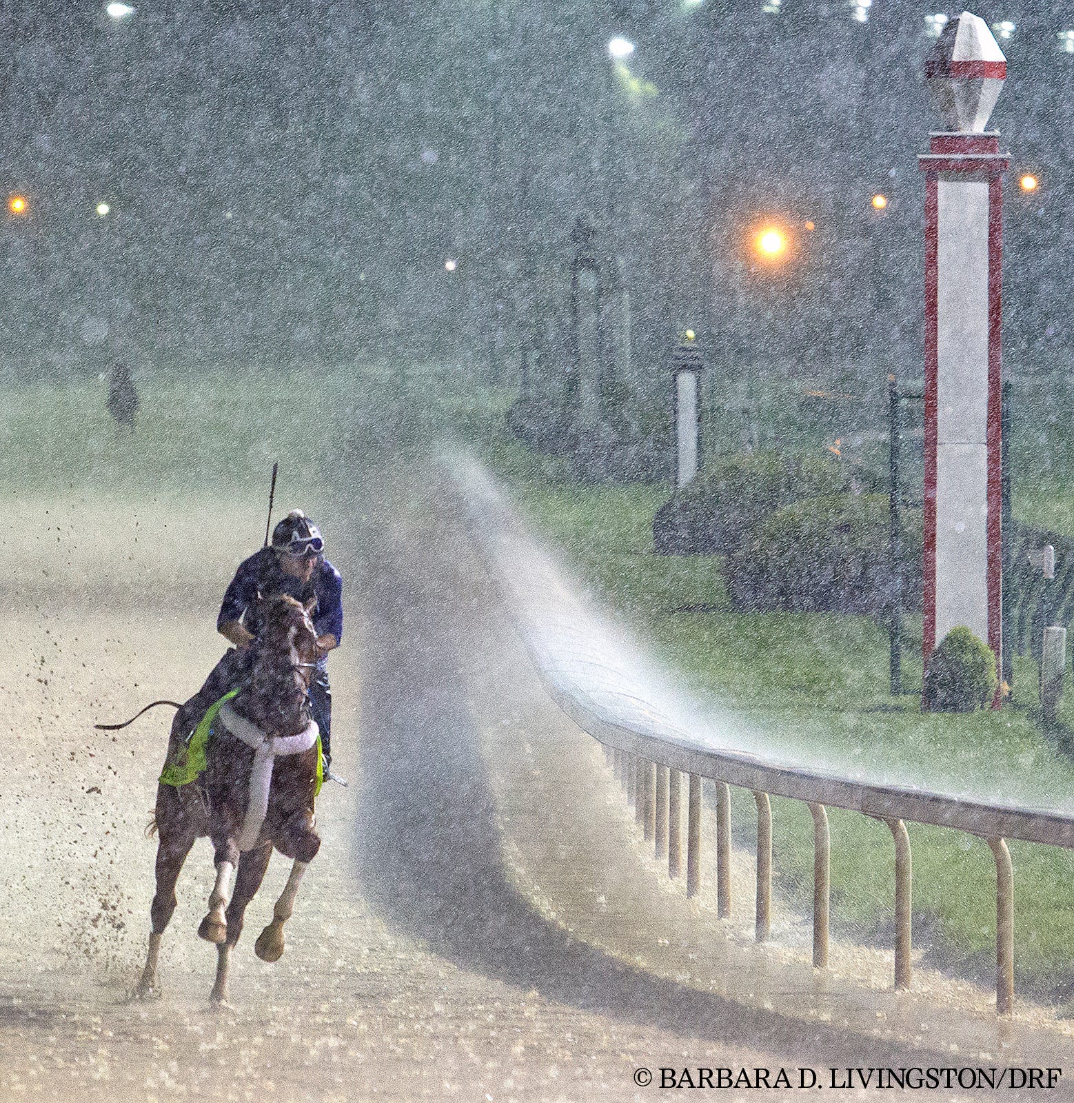 Despite rain and thunder, Tapiture breezes a half-mile in 50.16, finishing five furlongs in 1:05.61.