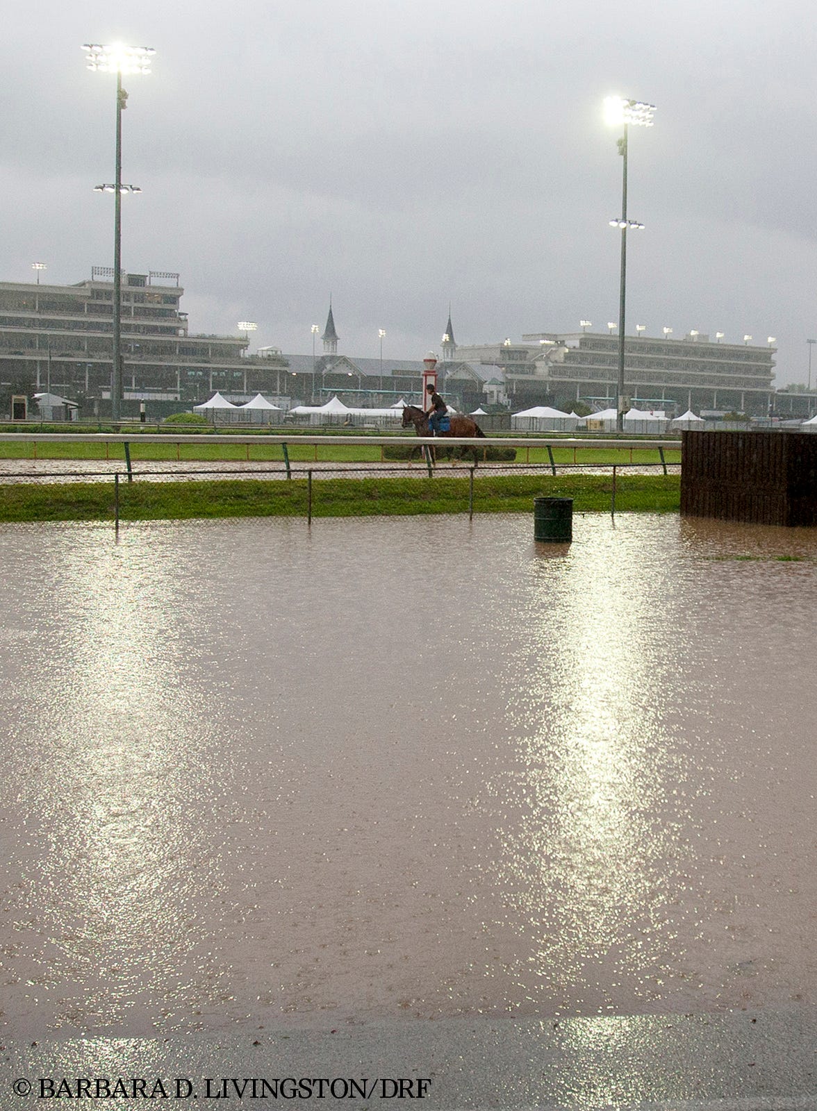 Rain puddles on the grounds of Churchill Downs Monday morning. A thunderstorm, and the associated lightning, caused a 37-minute delay in training session for Derby and Oaks horses.