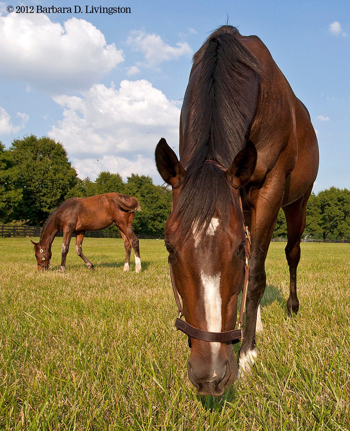 Rachel Alexandra grazes with her foal, by Curlin, in the background.