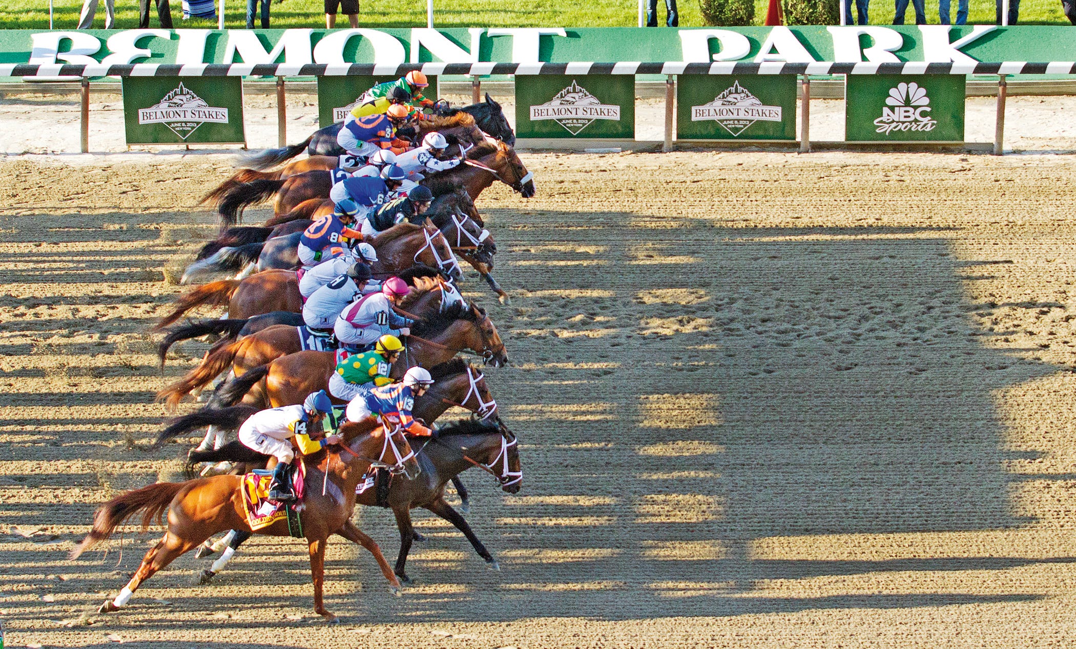 The shadow of the starting gate covers the field of 14 shortly after the break of the Belmont Stakes.