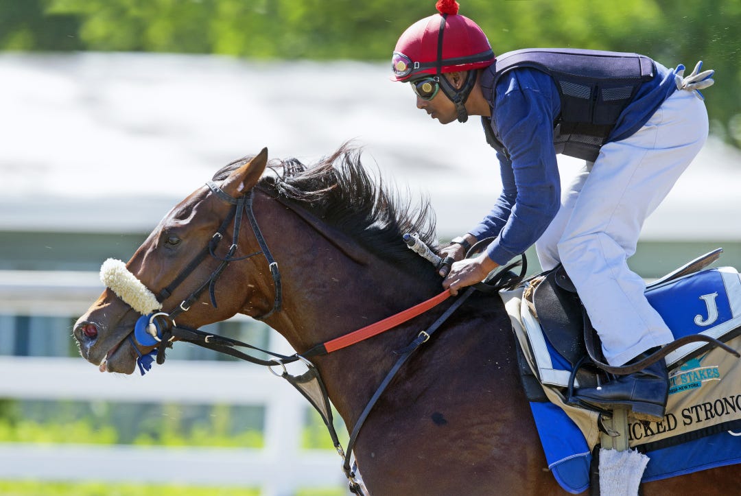 In his final workout in preparation for the 146th Belmont Stakes, Wicked Strong, the Wood Memorial winner, found himself about 30 yards behind Palace Malice – last year’s Belmont Stakes winner – who was preparing for Saturday’s Grade 1 Metropolitan Handicap. Exercise rider Kelvin Pahal did a good job keeping Wicked Strong in abeyance, but still, Wicked Strong worked a fast five furlongs in 59.17 seconds.
