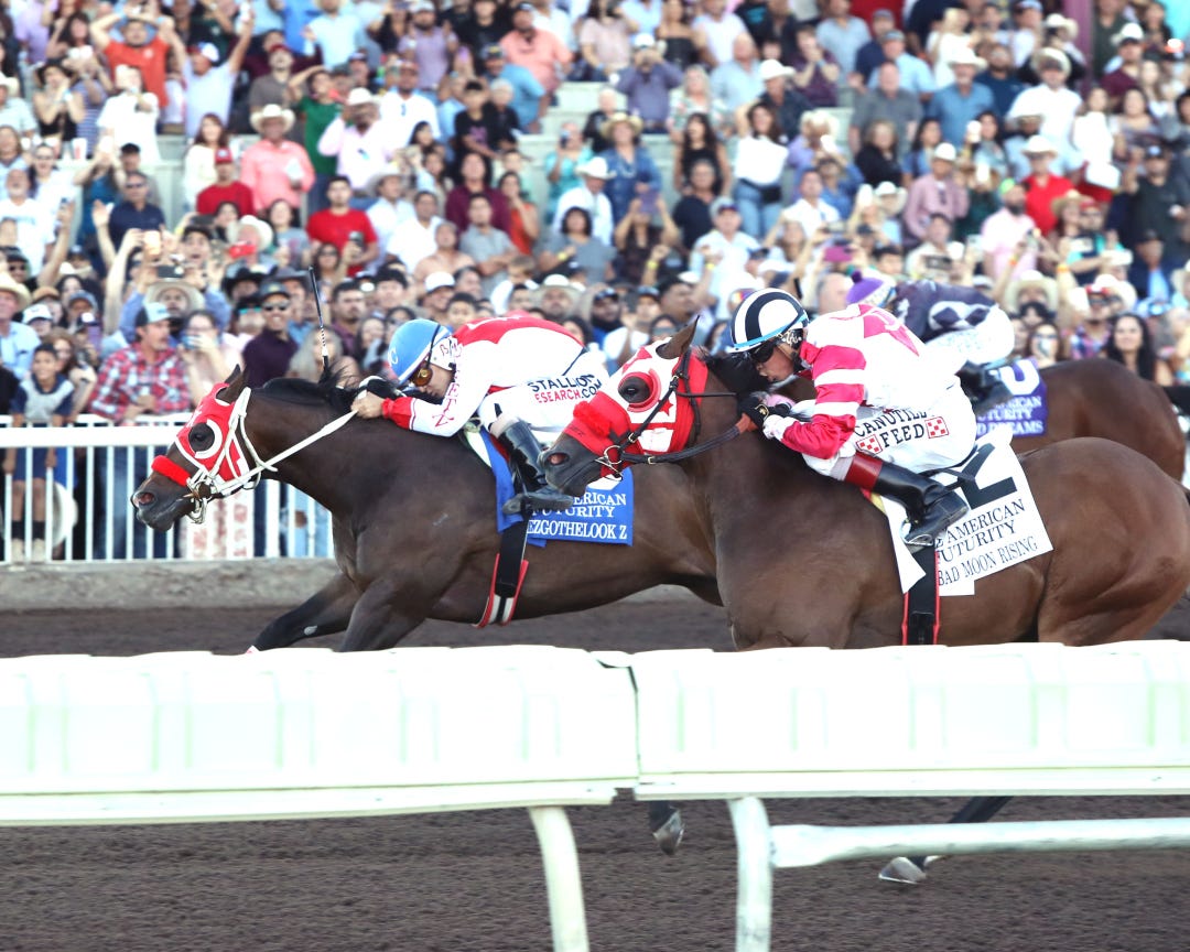 Hezgothelook Z wins the All American Futurity on Monday at the Downs at Albuquerque before an announced crowd of 10,865.