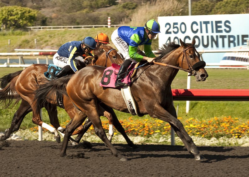 Points Offthebench (inside), making his stakes debut Sunday, beats Goldencents by a head in the Grade 1 Bing Crosby Stakes.