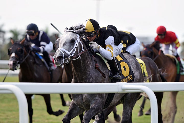 Halladay, by War Front out of a Tapit mare, wins the $75,000 Sunshine Forever Stakes at Gulfstream Park.