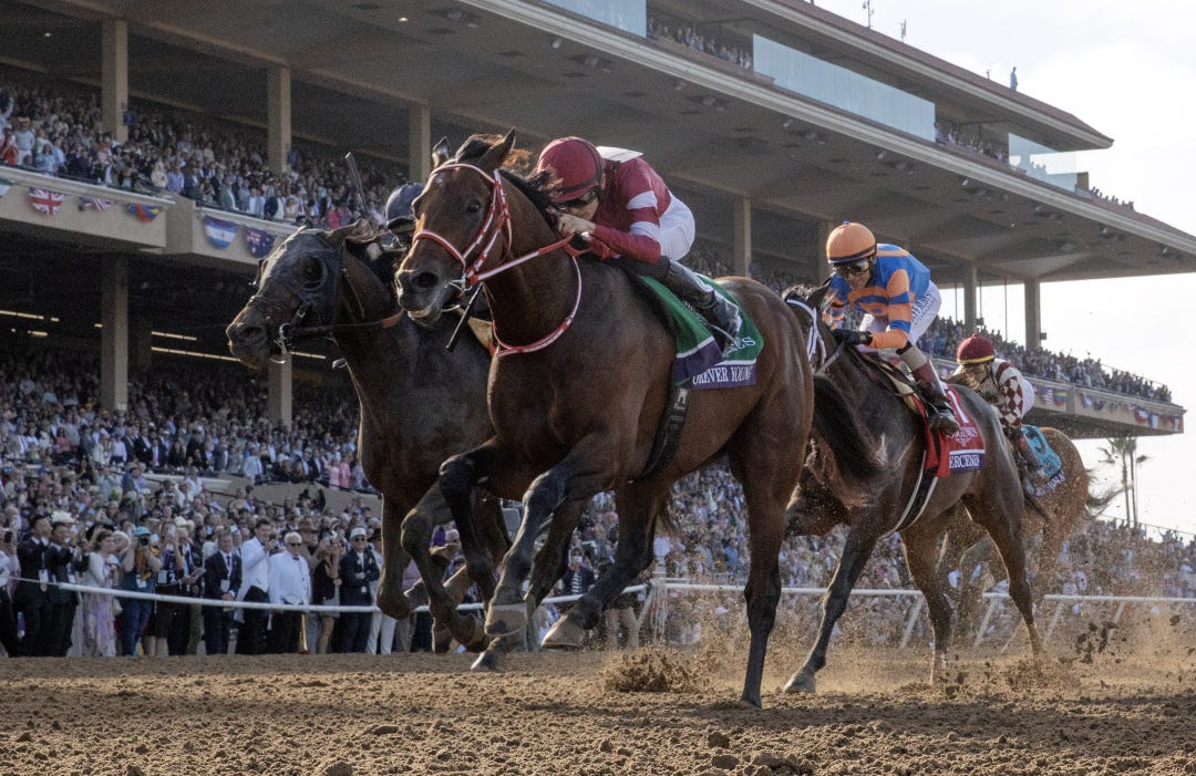 Forever Young, the Japan-based standout who wound up as North America’s champion older-male dirt horse of 2025, fought back in deep stretch to nail the Hong Kong superstar Romantic Warrior, who had sailed to the lead at the head of the homestretch, the winner’s share of $20 million on the line.