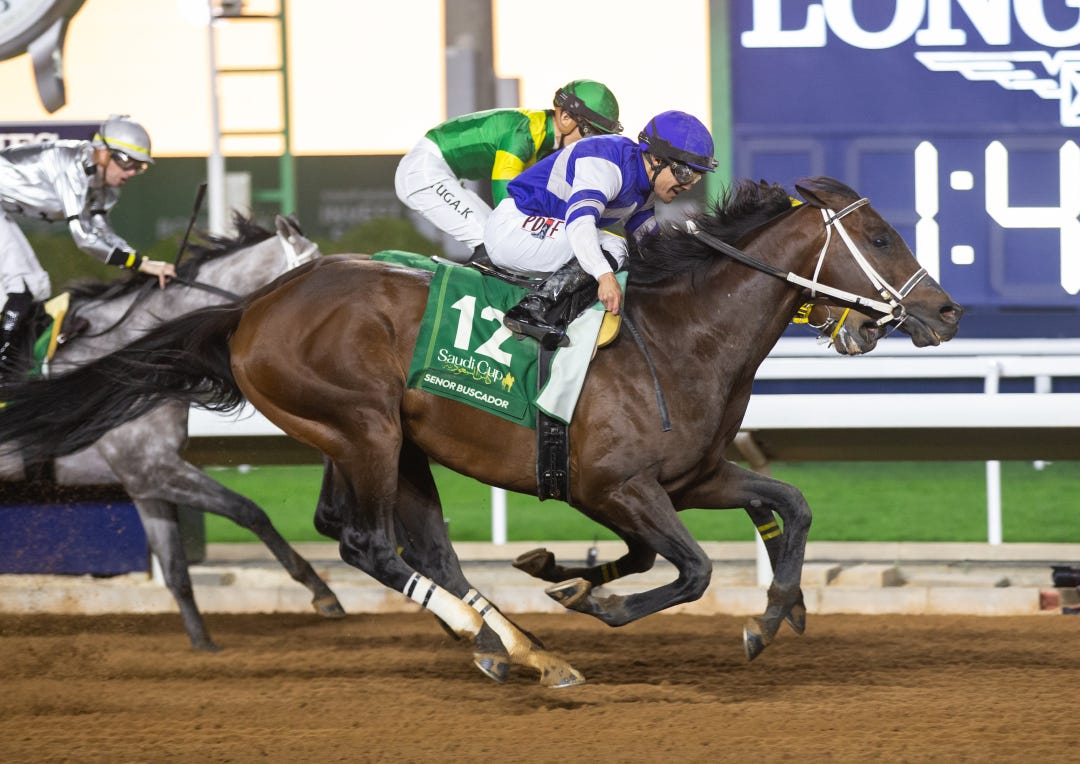 Senor Buscador beat Ushba Tesoro by a head in the Saudi Cup, a 1 1/8-mile race around one turn, but Ushba Tesoro is the defending champion in the two-turn, 1 1/4-mile Dubai World Cup, having captured the 2023 renewal by 2 3/4 lengths.