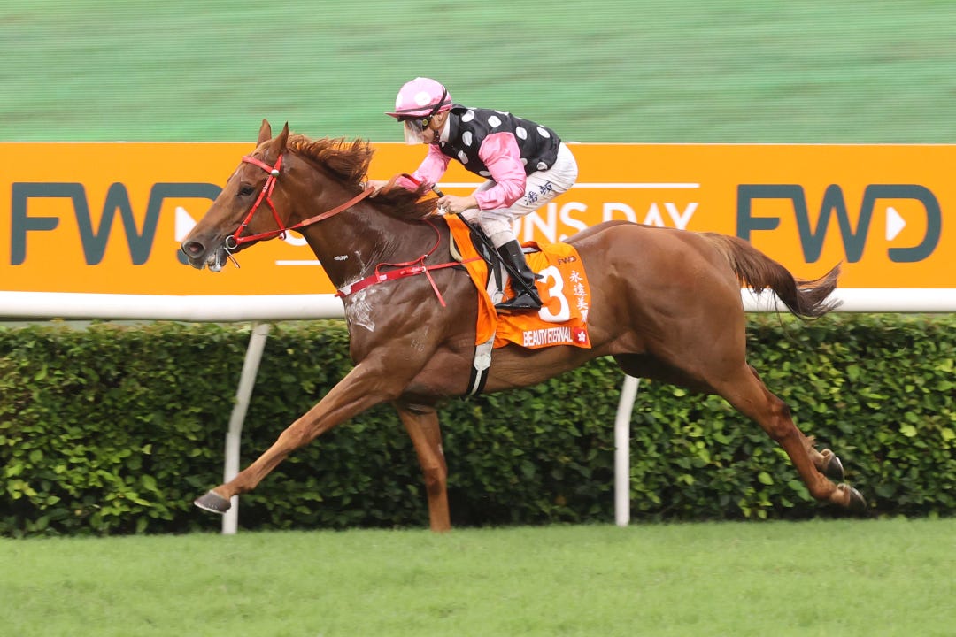 Ridden by Zac Purton for John Size, Beauty Eternal ($25.30) took the lead quickly and maintained an advantage on the inside throughout to win by 1 1/2 lengths over 29-1 Red Lion.