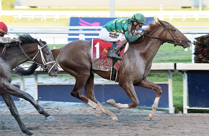 Owned by Qatar Racing, True Valour, 5, won his third stakes and his first in the United States in the Thunder Road Stakes at a mile on turf. True Valour has had four starts with Callaghan since he was imported from Ireland last summer.