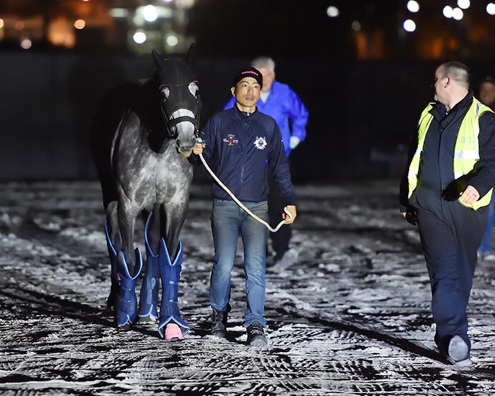 HALLANDALE BEACH, Fla. – Following a journey of more than 21 hours, the Japanese-bred Aerolithe arrived here early Wednesday, making her the first non-Florida-based arrival for either of the Pegasus World Cup events, set for next Saturday, Jan. 26. The 5-year-old mare was flown from Tokyo to South Korea to Alaska to Miami, pulling through the Gulfstream stable gate at about 3:15 a.m.
