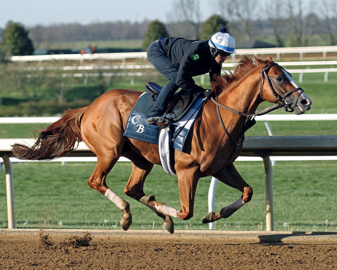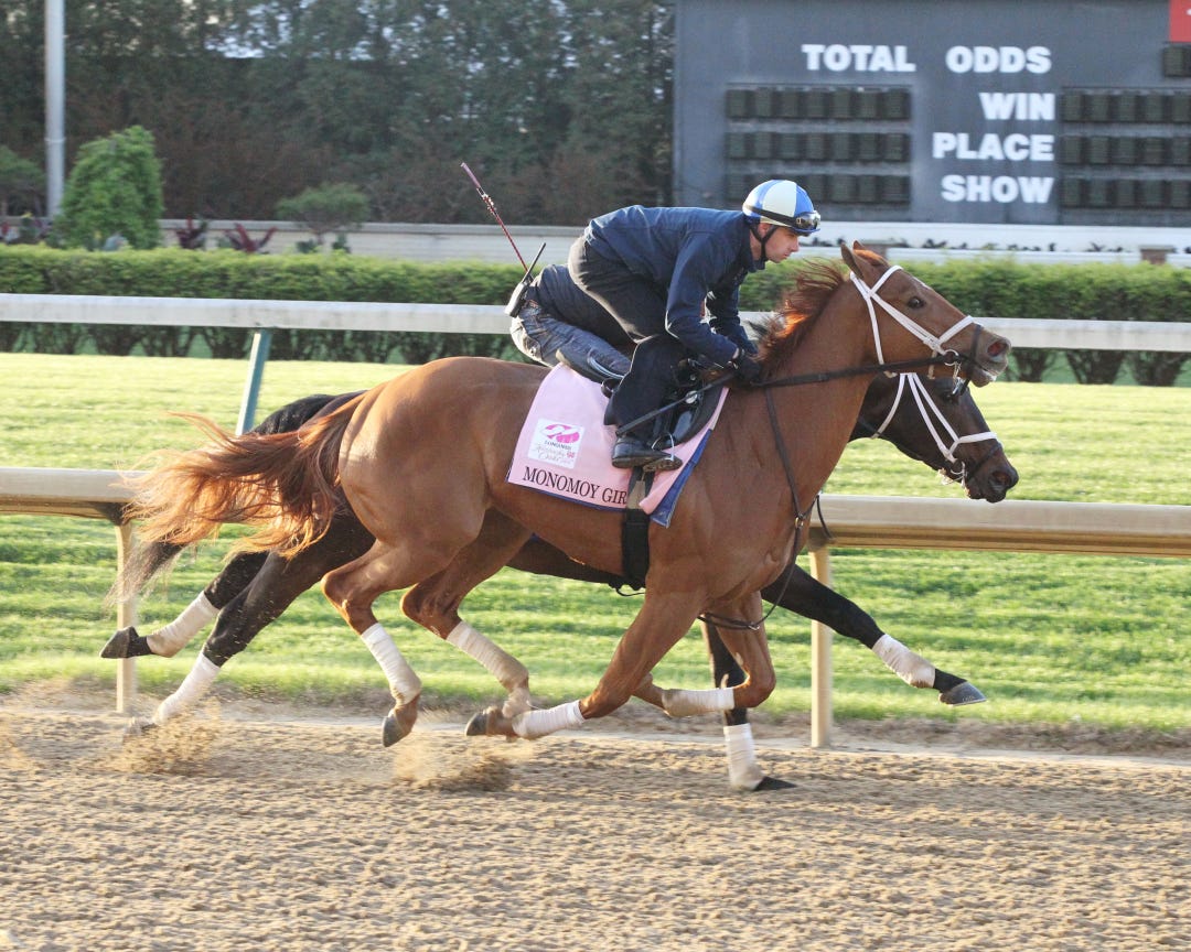 Working outside of her Brad Cox stablemate Compass Zone during the exclusive training period (7:30-7:45 a.m. Eastern) being reserved daily for Kentucky Derby and Oaks horses, Monomoy Girl went in 47.40 seconds, with a five-furlong gallop-out of 59.80. Florent Geroux, her regular rider, was aboard.
