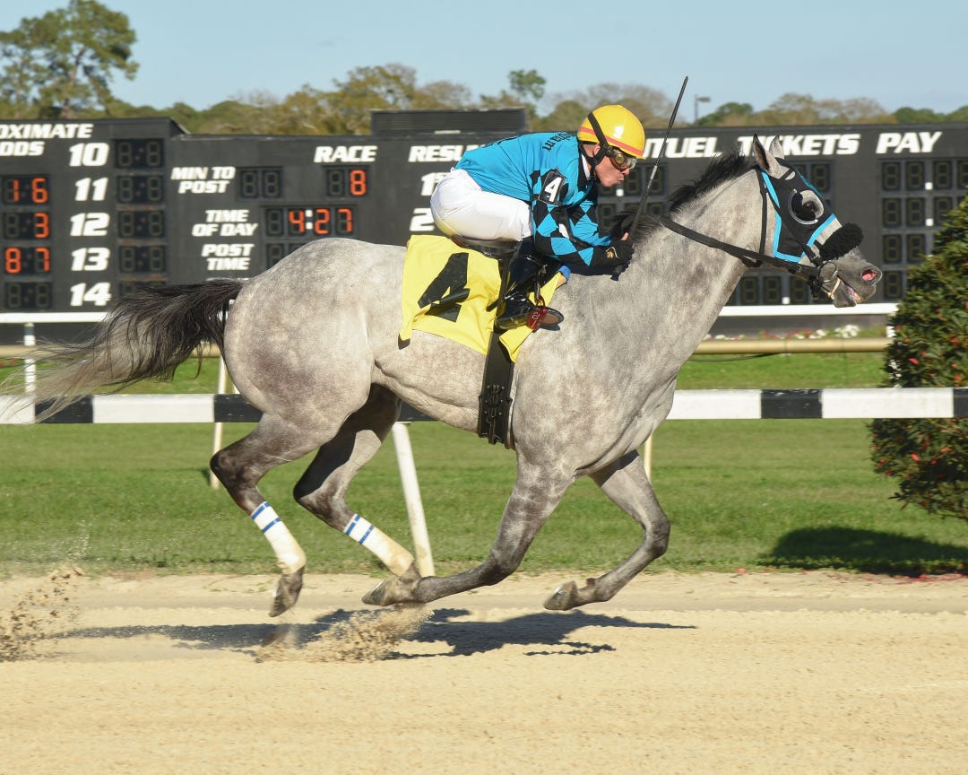 X Y Jet stamped his ticket to Dubai in winning the $100,000 Pelican Stakes on Saturday at Tampa Bay Downs.