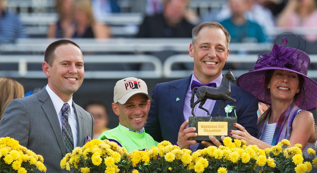 Bob Edwards (second from right), teamed with jockey Javier Castellano and trainer Chad Brown to win the 2016 BC Juvenile Fillies Turf with New Money Honey.