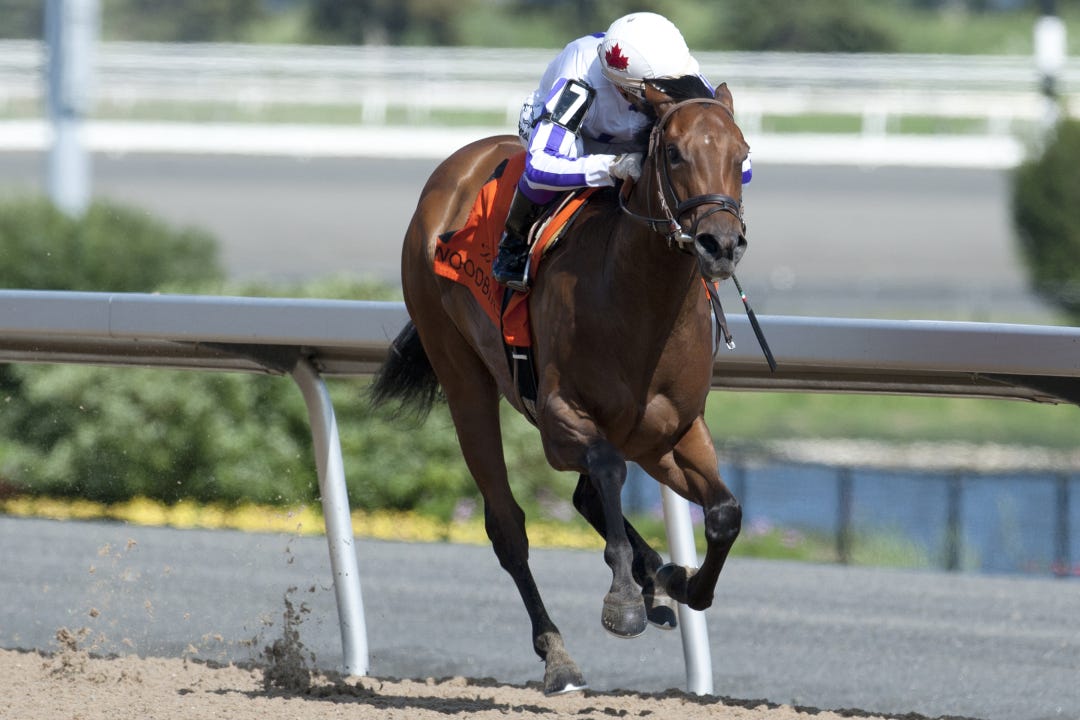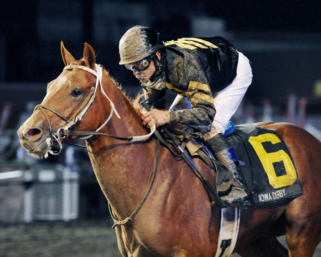 It’s Thoroughbred Aftercare Alliance Day at the western Kentucky track, with a number of activities and tributes honoring retired racehorses on the docket. Brass Hat is the literal poster boy: Free posters will be given to those in attendance, with owner and trainer Buff Bradley and Hall of Fame jockey Calvin Borel available for autographs.