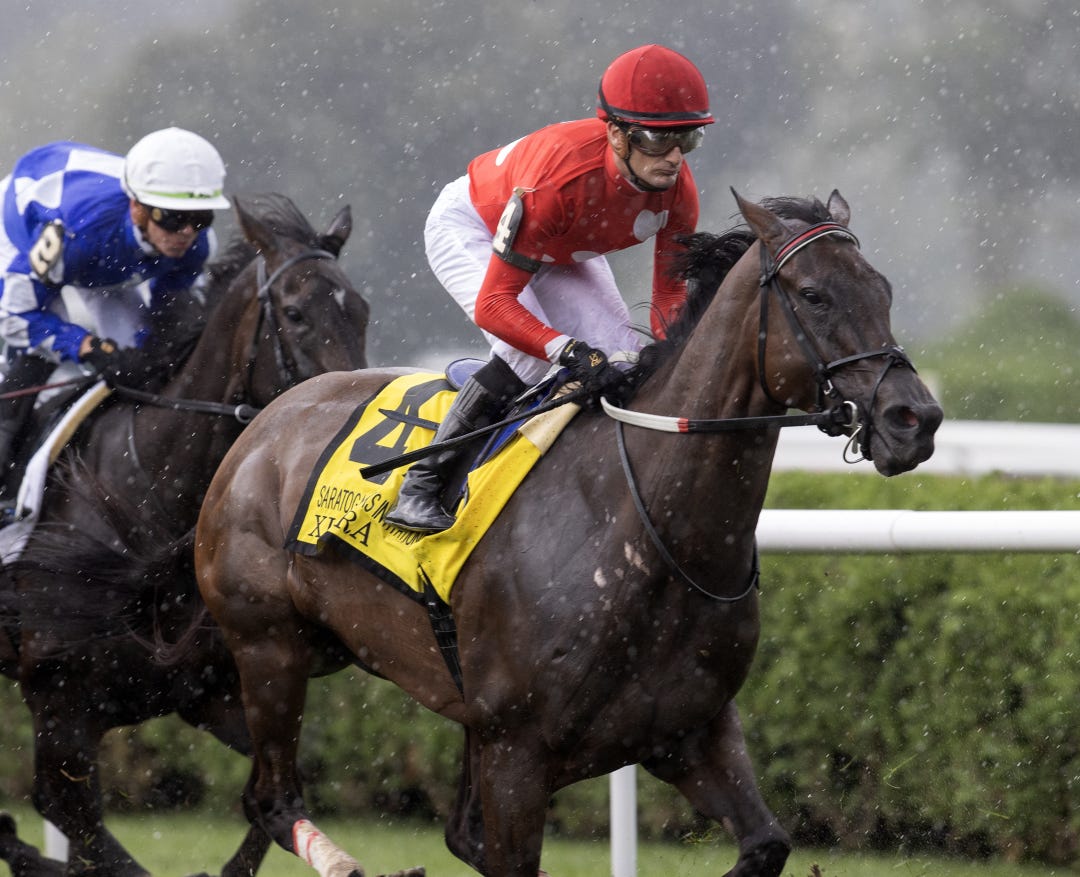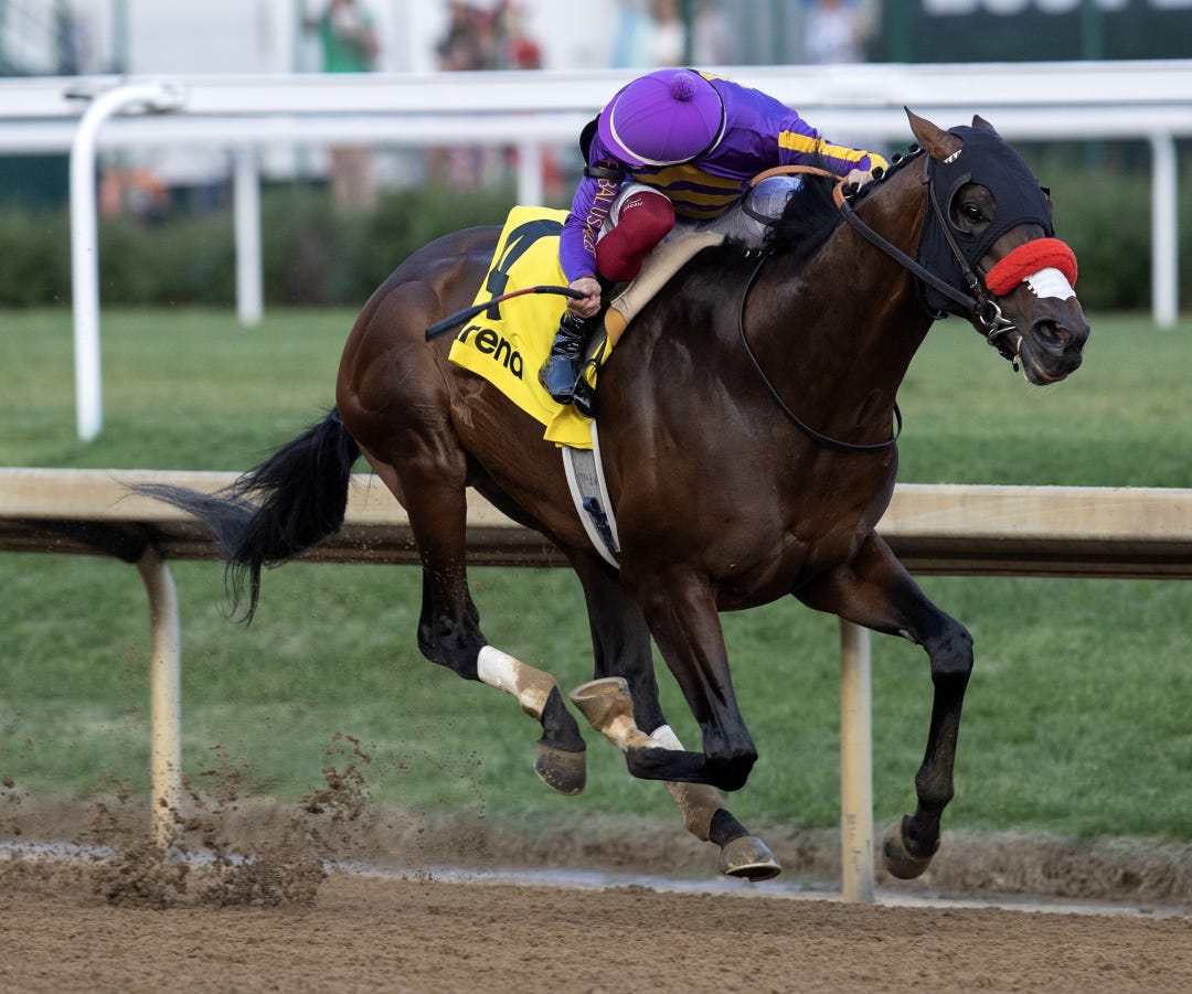 In Saturday’s 13th race, following the Derby, Raging Torrent went wire to wire in a first-level allowance, winning by more than eight lengths, his seven-furlong time of 1:21.13 good for a 104 Beyer.