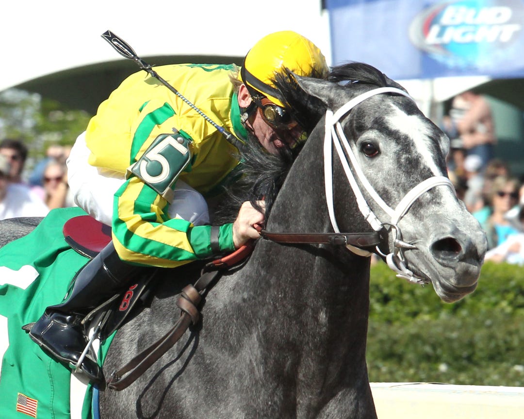 Promise Me Silver, under rider Cliff Berry, wins the Instant Racing Stakes on the undercard of the 2015 Arkansas Derby.