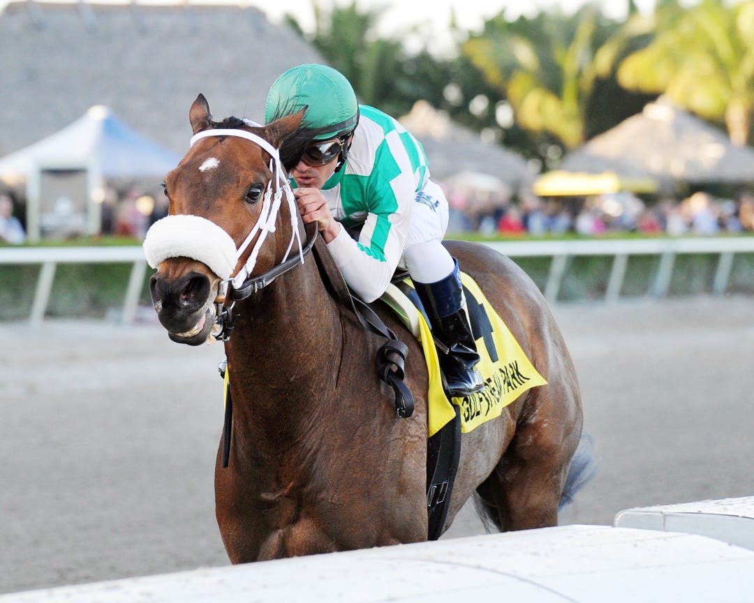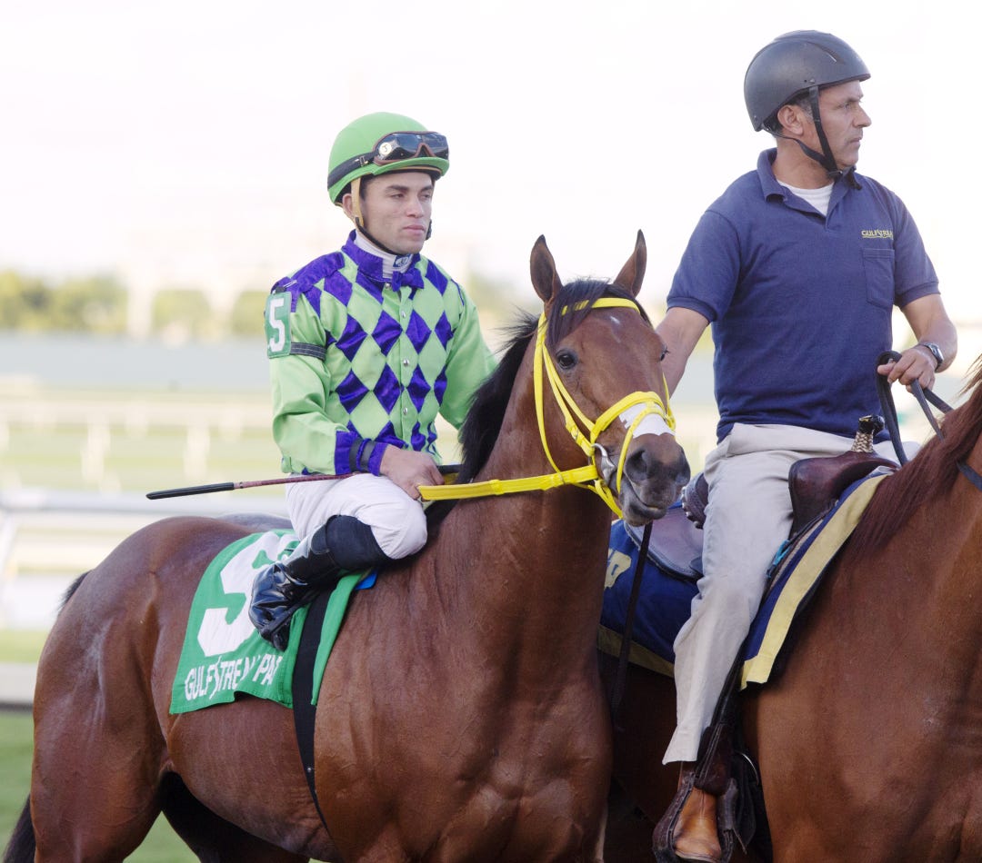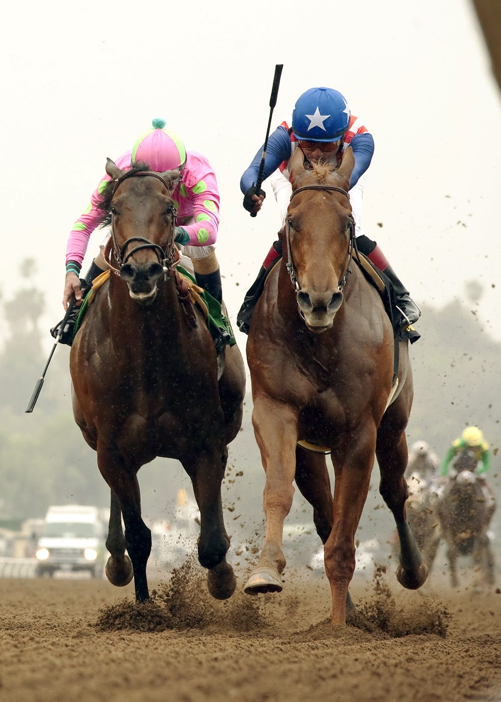 Gary Stevens rides Firing Line, who was a close second to Dortmund in the Robert Lewis and Los Alamitos Futurity in his last two starts. He is trained by Simon Callaghan.