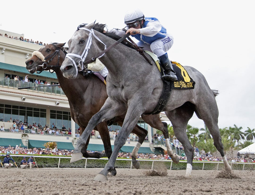 In her stakes debut, In Tune held off a prolonged challenge from House Rules to win the Grade 2, $300,000 Gulfstream Oaks by a neck to remain undefeated in three career starts and secure a spot in the $1 million Kentucky Oaks on May 2.