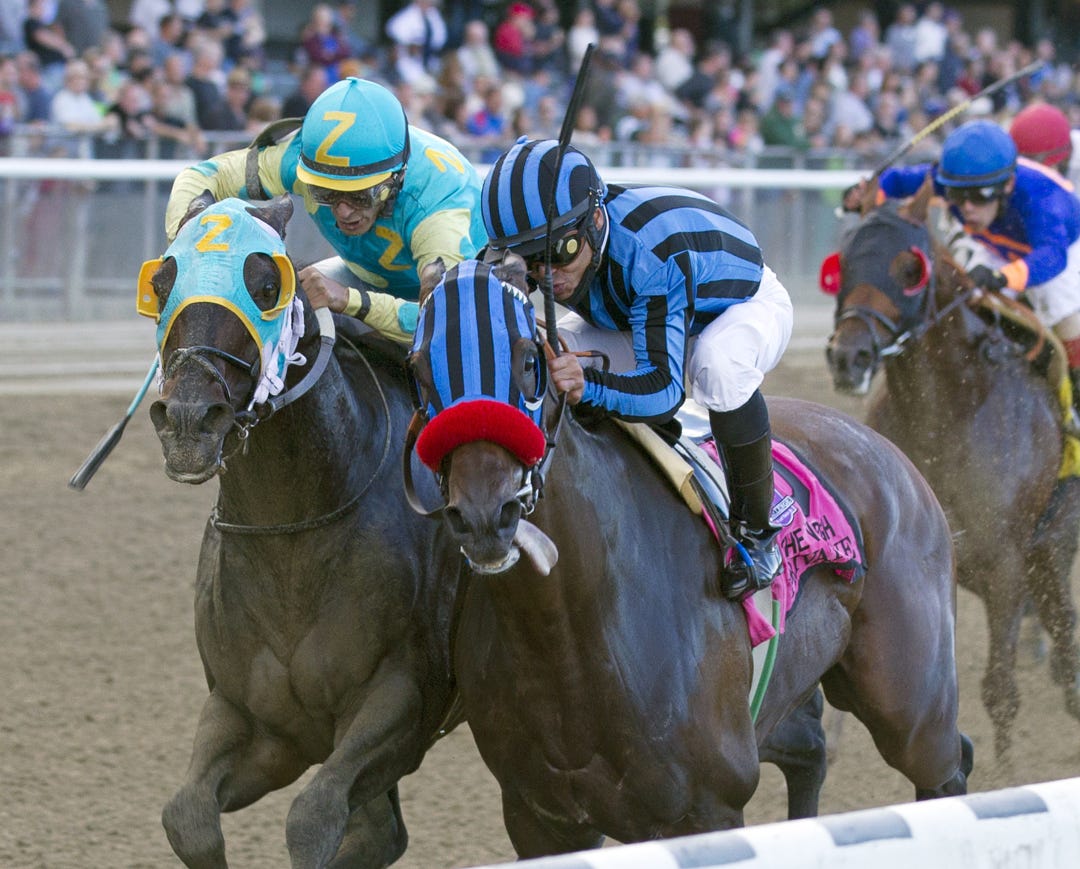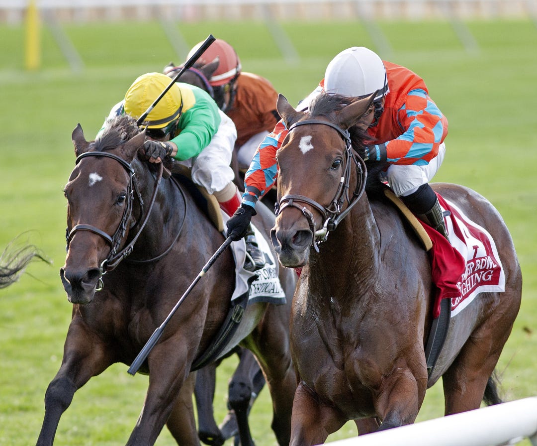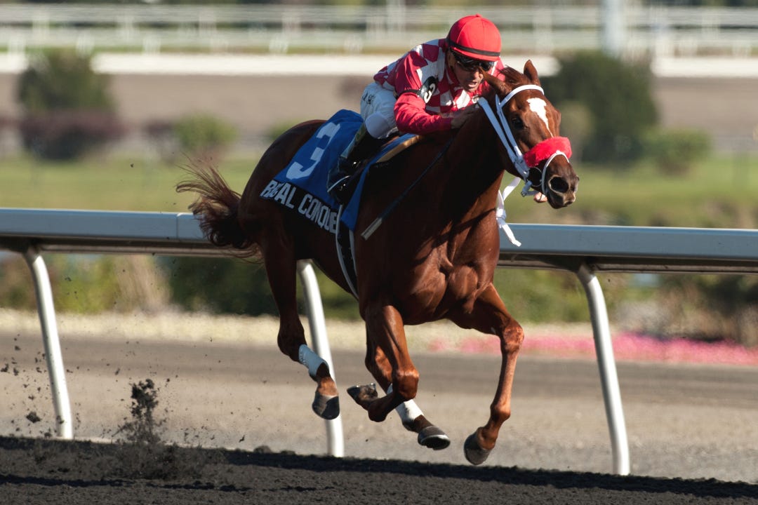HALLANDALE BEACH, Fla. - Parranda, who usually does her best running from mid-pack or beyond, found herself closer than usual to a snail-like pace and made the most of the golden opportunity, drawing off to a 2 1/4-length victory over Millennia in Saturday’s $100,000 Our Dear Peggy Stakes on the turf at Gulfstream Park. Sola Gratia, the even-money favorite, finished fourth after steadying in traffic on the final turn.