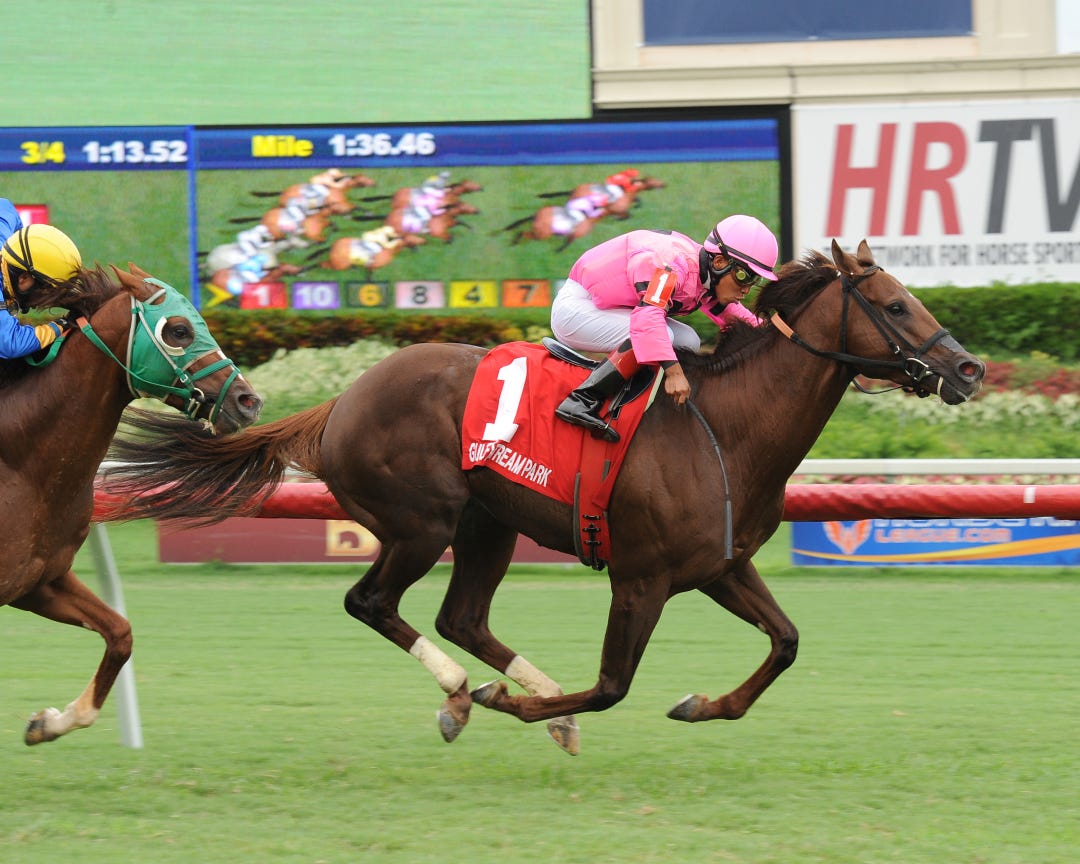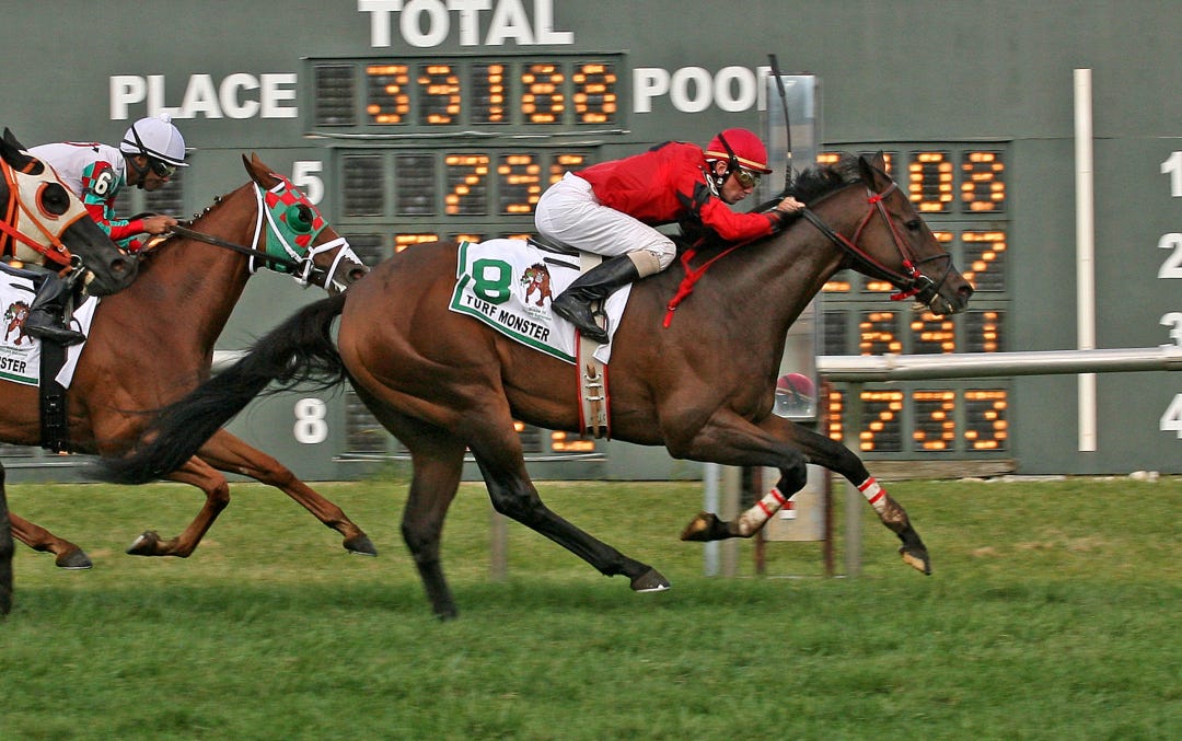 Ridden by Stewart Elliott of Smarty Jones fame, Stormofthecentury returned $59.40 in defeating some of the top turf sprinters on the East Coast. Owned by Beechwood Racing Stable and trained by Lou Roberto Jr., the 5-year-old Florida-bred gelding was making just his third start on turf. He finished the five-furlong distance in 57.44 seconds over a course left yielding after heavy rains earlier in the day.