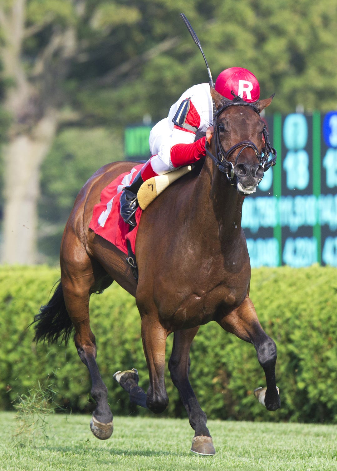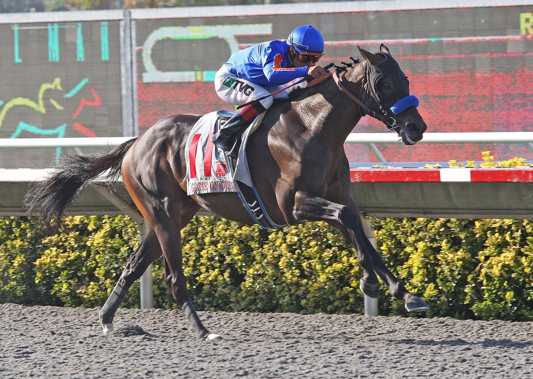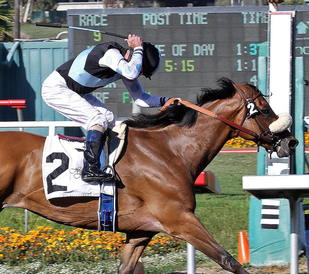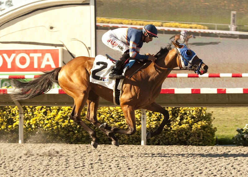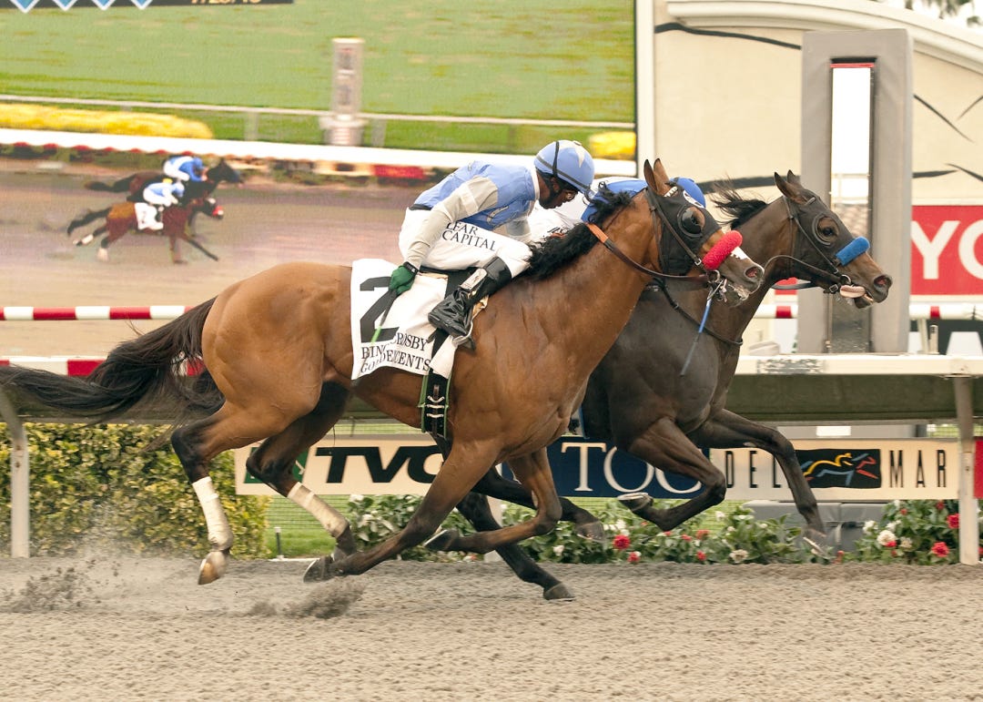 On Rainbow Bridge and Lexie Lou both came wide to link up on the lead early in the stretch of the 6 1/2-furlong dash for 2-year-old fillies. On Rainbow Bridge, under apprentice Skye Chernetz, gamely held off Lexie Lou while drifting out to prevail by a nose in 1:16.87.