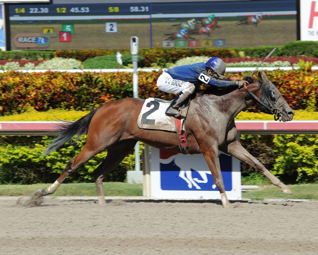 My Pal Chrisy surpassed the $500,000 mark in career earnings Saturday at Gulfstream Park, when she closed from last to win the $113,000 Paseana by 6 3/4 lengths. Isabelle’s Thunder rallied for second in the six-furlong race for fillies and mares, while it was another head back in third to pacesetter Capitalism At Risk.