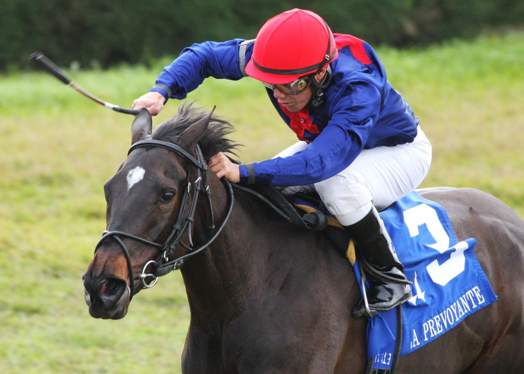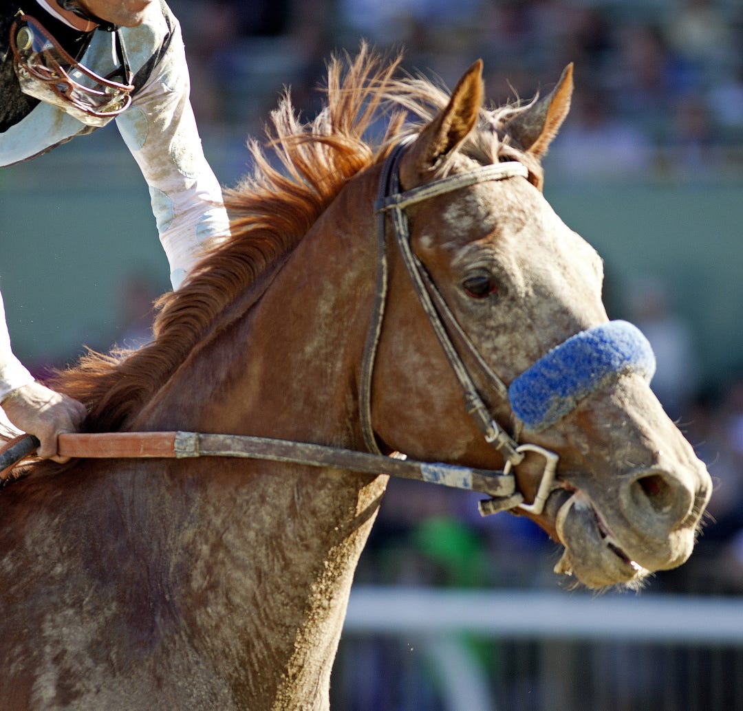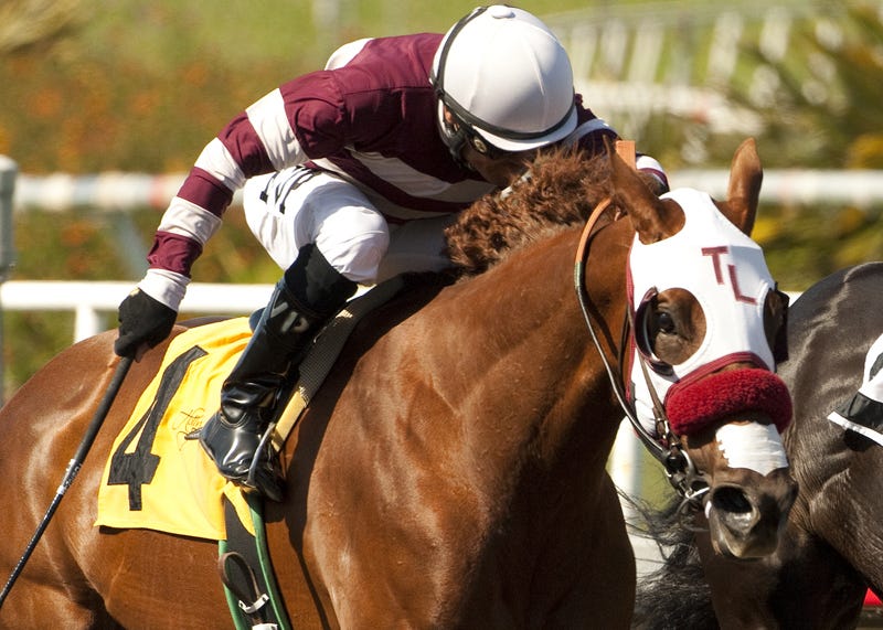 Martin Pedroza, in his first day back riding after sustaining broken ribs two weeks ago, urges Willa B Awesome to a nose victory in the Melair.