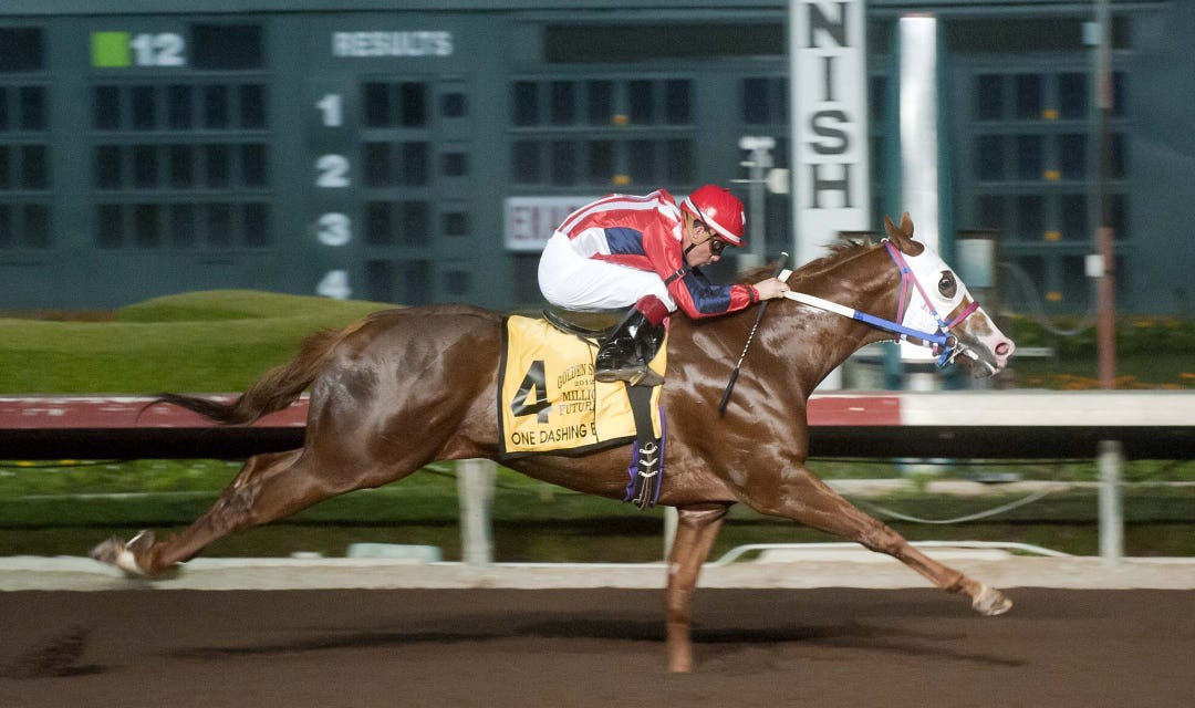 LOS ALAMITOS, Calif. – One Dashing Eagle became the first Quarter Horse to win three seven-figure races in the same year with an easy win in Sunday’s $1,118,000 Golden State Million Futurity at Los Alamitos.