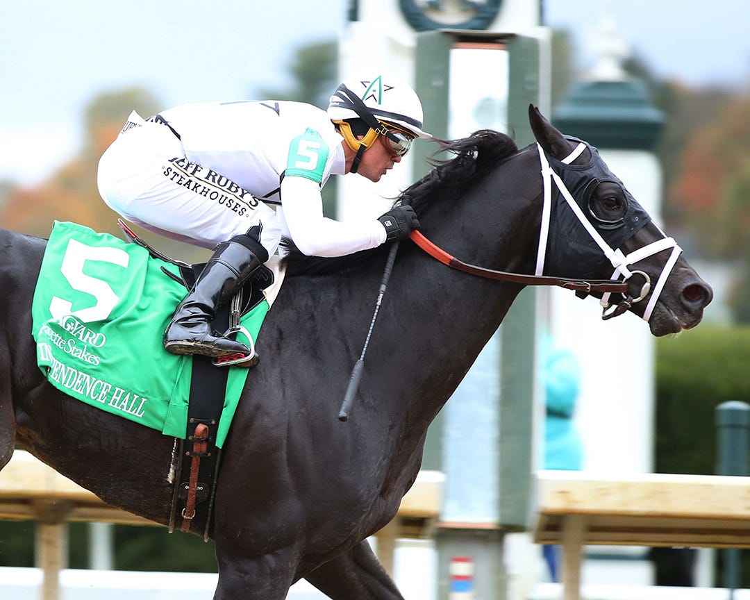 LOUISVILLE, Ky. – Independence Hall earned a career-best 105 Beyer Speed Figure in his 7 1/4-length romp over a sloppy track Saturday in the closing-day Fayette Stakes at Keeneland.