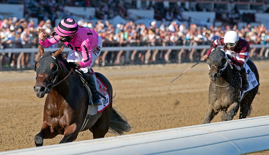 Wicked Sunset was closing with interest when Amador rose from the saddle as the field passed an infield placing judge’s stand in the final sixteenth. Amador rode 5-2 Wicked Sunset more vigorously in the final strides, but finished three-quarters of a length behind pacesetter Back Beauty ($6.40).