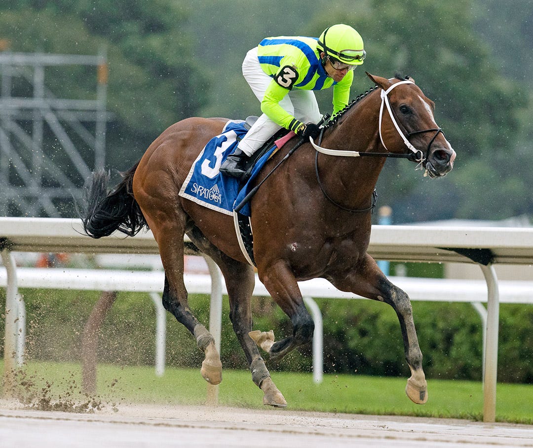 Jackie’s Warrior splashed his way to a 7 1/4-length victory in Sunday’s Grade 2, $200,000 Amsterdam Stakes, dueling with and running away from Drain the Clock, who finished second. Drain the Clock had defeated Jackie’s Warrior by one length in the Grade 1 Woody Stephens at Belmont on June 5.