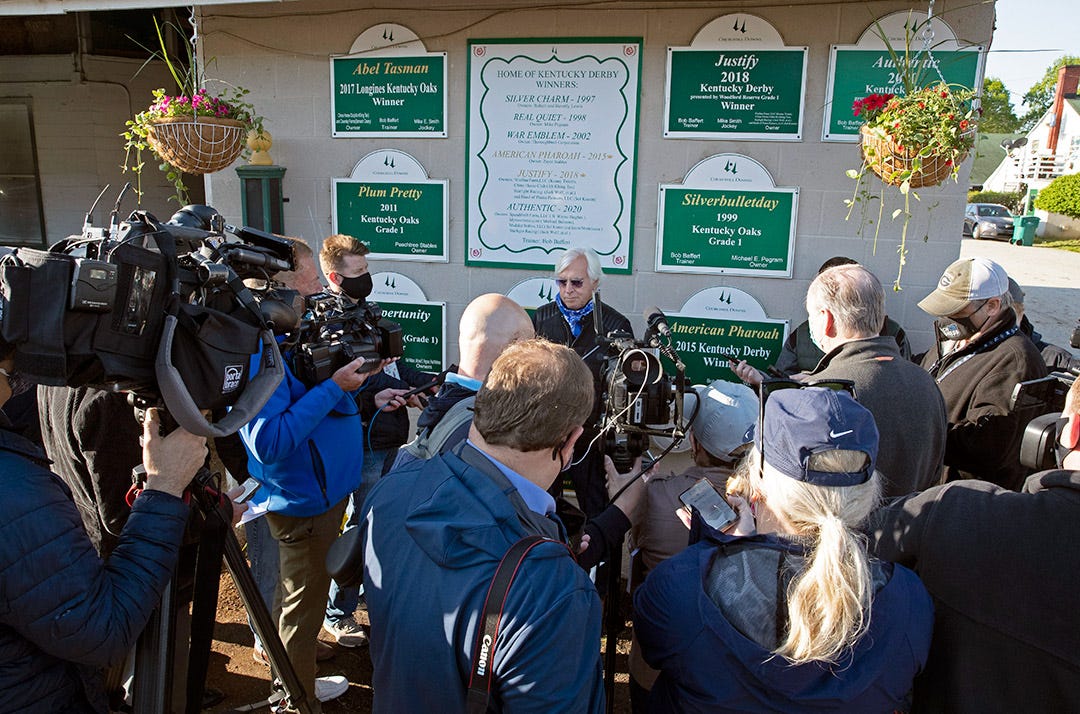 Steve Asmussen visits with his Kentucky Derby contender Midnight Bourbon. Asmussen has 9,229 wins through Sunday, putting him only 146 from Dale Baird’s all-time record.