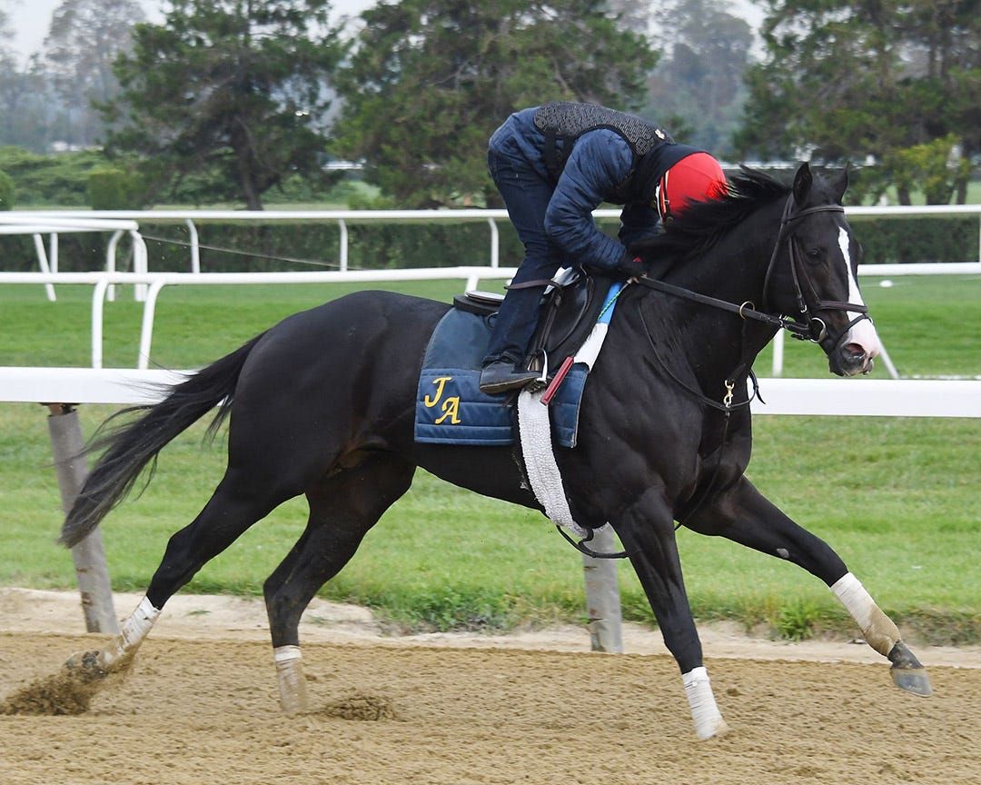 ARCADIA, Calif. – Hot Rod Charlie, the Louisiana Derby winner, worked five furlongs in 1:01.20 on Saturday morning at Santa Anita as he moves on toward the Kentucky Derby on May 1, but it was the person on his back, as much as the quality of the work, that was noteworthy.