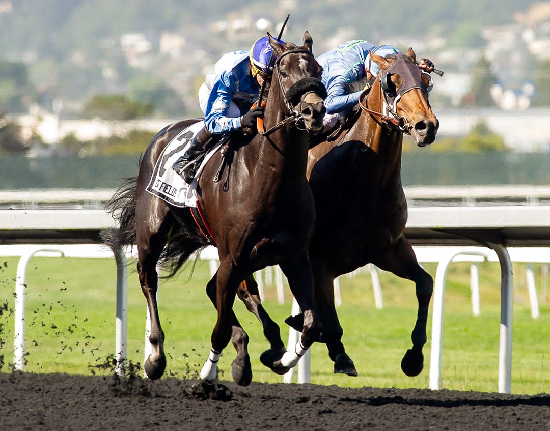 Restrainedvengence (left) wins the All American Stakes at Golden Gate. Trainer Val Brinkerhoff is now using glue-on shoes on him.