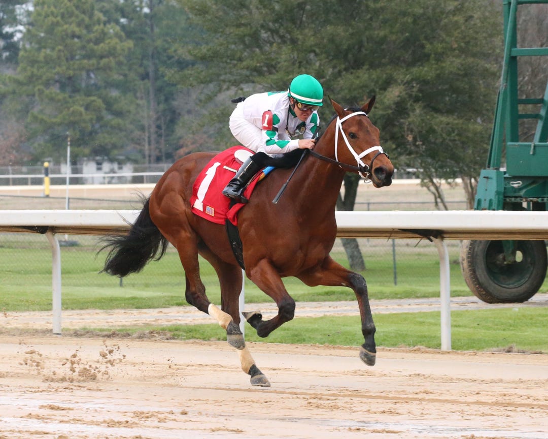 Wells Bayou, shown winning an allowance at Oaklawn on Jan. 26, is a intriguing new player in the Louisiana 3-year-old division.