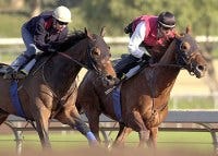 Big Cap contender Fancy As (left), Dana Barnes up, works Monday with stablemate Pie N Burger (Pepe Aragon).