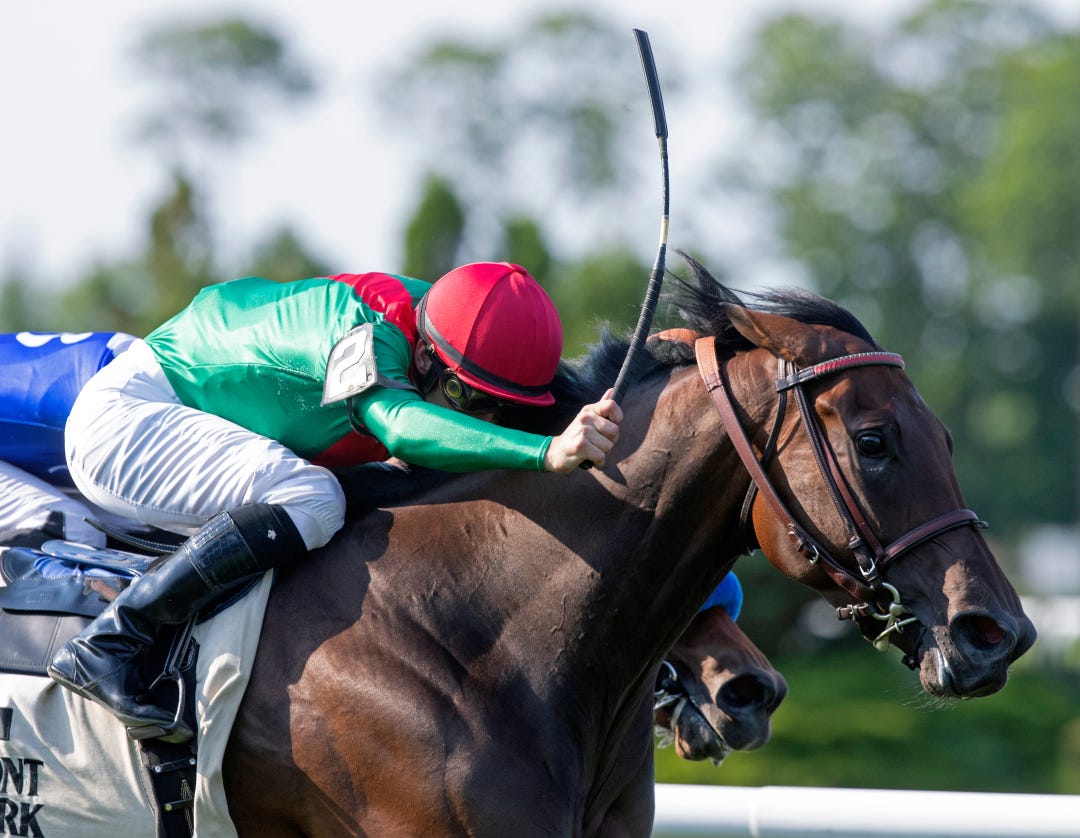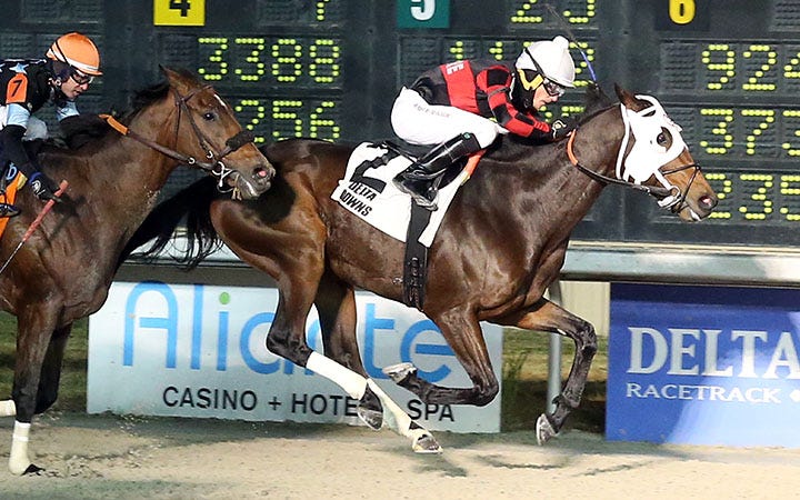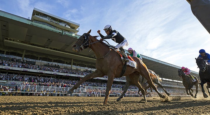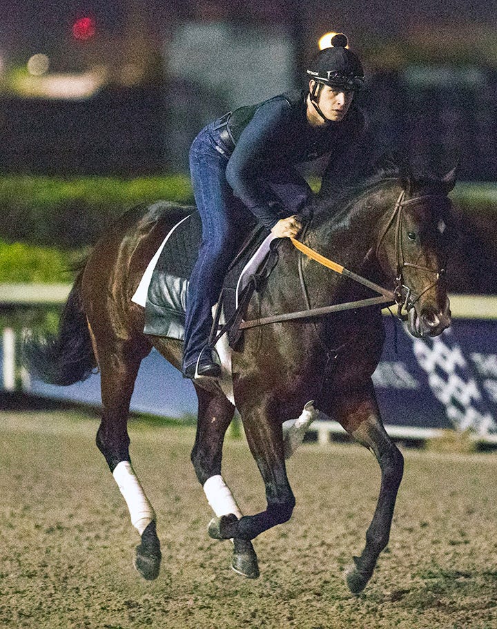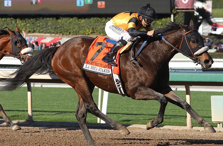 La Sardane was fourth in the 2019 Megahertz and was involved in a frightening two-horse spill in the Grade 3 San Simeon Stakes on the hillside turf course last March. Arms Runner suffered a fatal injury while racing in front of La Sardane, who was unable to avoid her fallen rival.