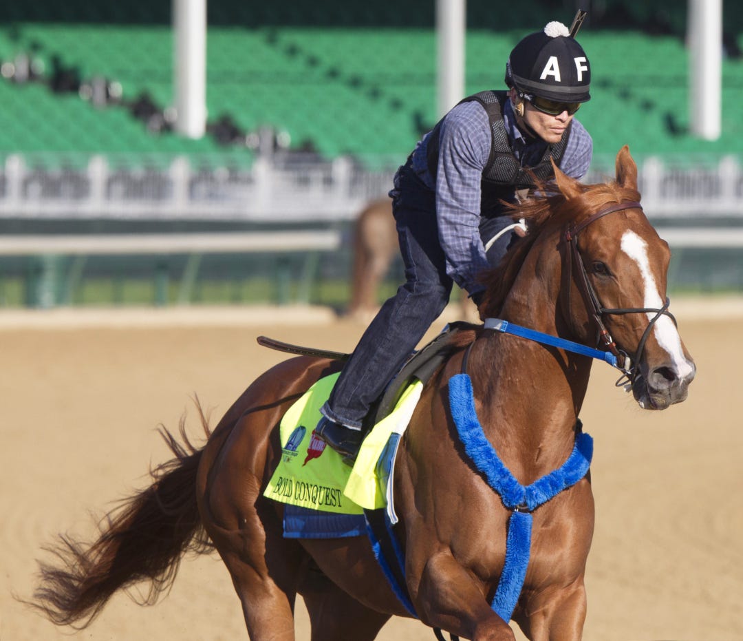 LOUISVILLE, Ky. – The first sightings of the recently arrived California contingent – DORTMUND, FIRING LINE, and BOLO – were among the highlights of Monday’s Kentucky Derby-Oaks training session, which also featured a five-furlong work by BOLD CONQUEST, who still needs help to crack the Derby’s starting lineup.