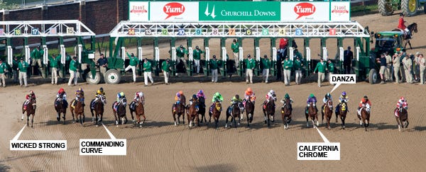 California Chrome breaks alertly alongside Danza, while both Wicked Strong and Commanding Curve are forced to take back from their outside posts. [Photo by John Bambury]