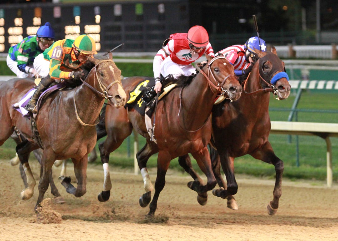 LOUISVILLE, Ky. – Bayern finished first Saturday night in the 90th running of the Grade 3, $176,700 Derby Trial at Churchill Downs, but the colt was quickly disqualified for herding Embellishing Bob, who dueled fiercely just outside the odds-on favorite for virtually the entire one-mile trip.