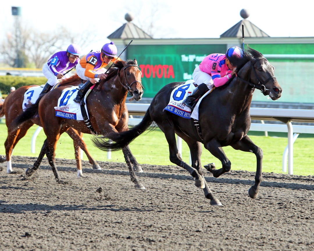 In a “do or die” Kentucky Derby qualifying race for seven of the eight starters, the Todd Pletcher-trained Danza skimmed the rail coming out of the final turn to post a 41-1 upset over Ride On Curlin. Both the top two finishers earned spots in America’s most famous race, while highly touted Bayern finished third as the 8-5 betting favorite.