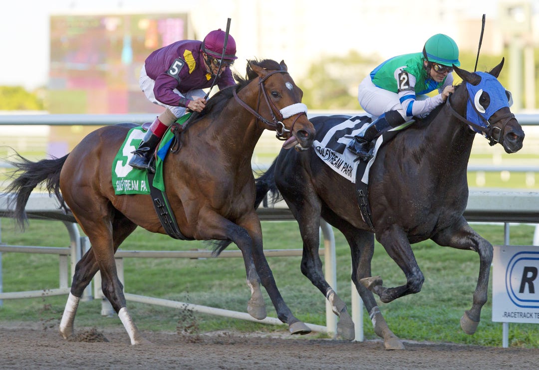 Reveron holds off Casual Trick to win the $100,000 Gulfstream Park Derby by a half-length.