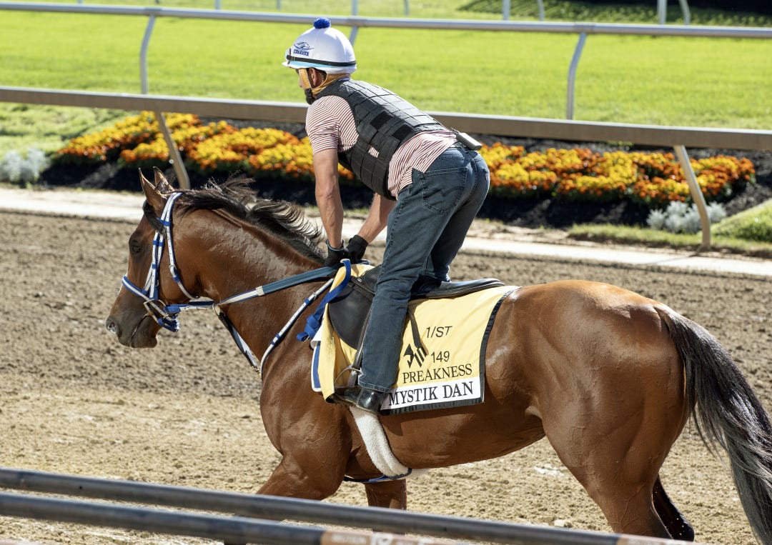 BALTIMORE -- Mystik Dan took another leisurely stroll over the Pimlico main track Tuesday morning, galloping about 1 1/2 miles over a fast main track as preparations for Saturday’s $2 million Preakness continued on a quiet, overcast morning.