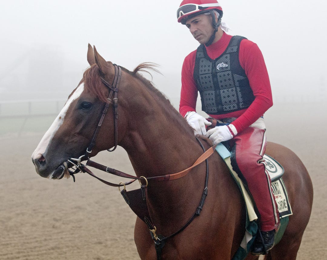 [bc_video_id:324591:]BALTIMORE – California Chrome, the Kentucky Derby winner, had a routine gallop of two miles on Friday morning at Pimlico during conditions that were anything but routine, a heavy downpour that left the track sloppy and forced the afternoon’s grass races to be moved to the main track.